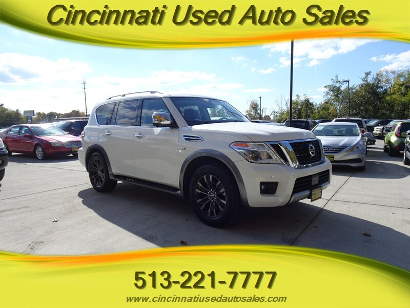 THIS 2017 NISSAN ARMADA PLATINUM AWD IS IN EXCELLENT CONDITION IN AND OUT! THIS VEHICLE INCLUDES A 3 MONTH/4500 MILE POWERTRAIN WARRANTY! ASK ABOUT OUR GREAT FINANCE OPTIONS! LOADED TO THE GILLS LADIES AND GENTLEMEN! BEAUTIFUL TAN LEATHER INTERIOR! 360 DEGREE CAMERA! POWER SEATS! HEATED SEATS AND VENTILATED SEATS! PRICED TO SELL QUICK! QUICK! QUICK! HURRY IN, THIS GREAT DEAL WON'T LAST LONG! FOR MORE GREAT DEALS AND IMAGES OF THIS BEAUTIFUL VEHICLE VISIT WWW.CINCINNATIUSEDAUTOSALES.COM! ASK FOR JUSTIN OR ZACK! **WARRANTY INCLUDED AT ASKING PRICE!